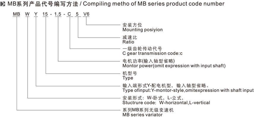 MB系列無級(jí)變速機(jī)代號(hào)編寫方法有:MB W Y 15 - 1.5 - C 5 V6