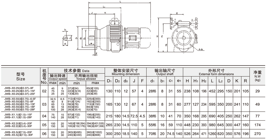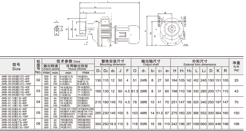 JWB-X系列無級變速機一級二級參數(shù)與尺寸表