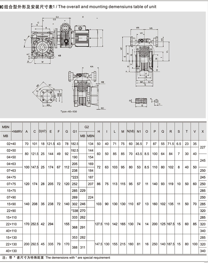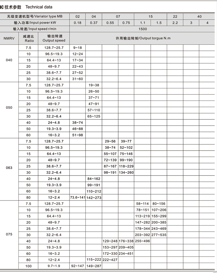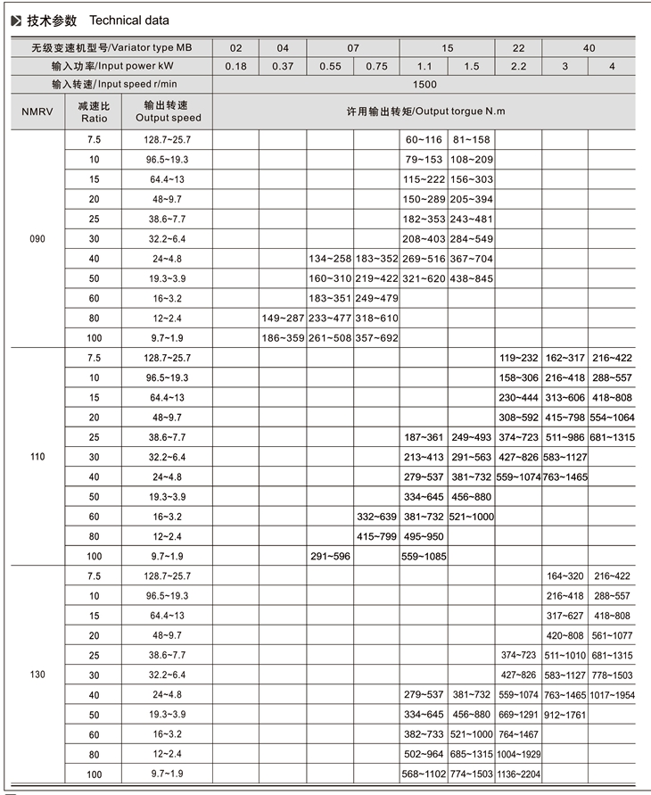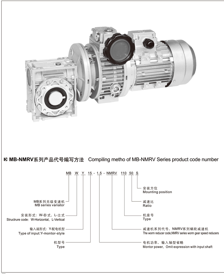 MB-NMRV組合系列無級變速機(jī)是由MB無級變速機(jī)與RV蝸輪減速機(jī)完美組合。